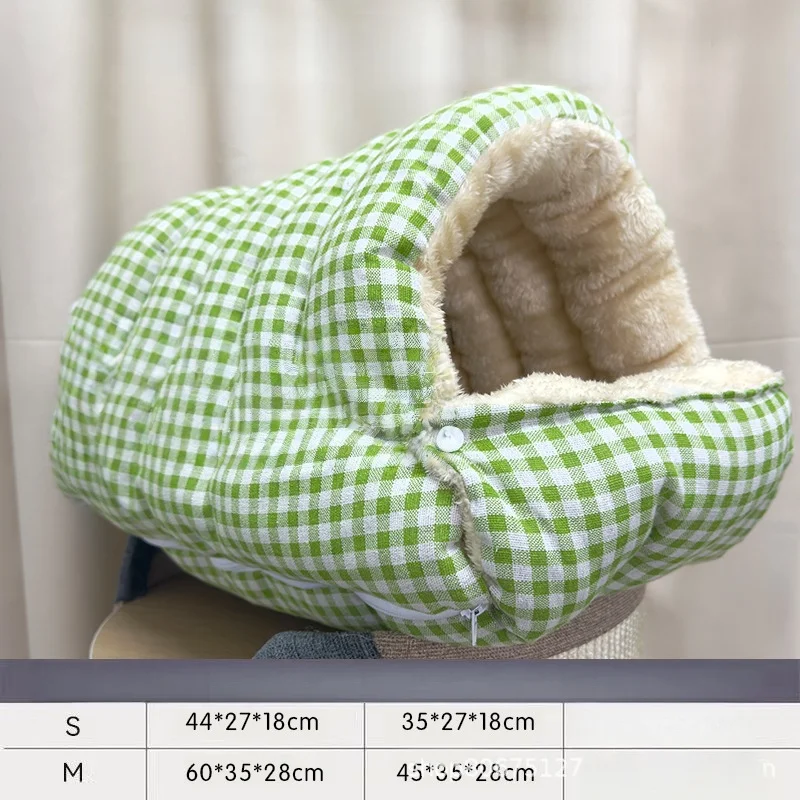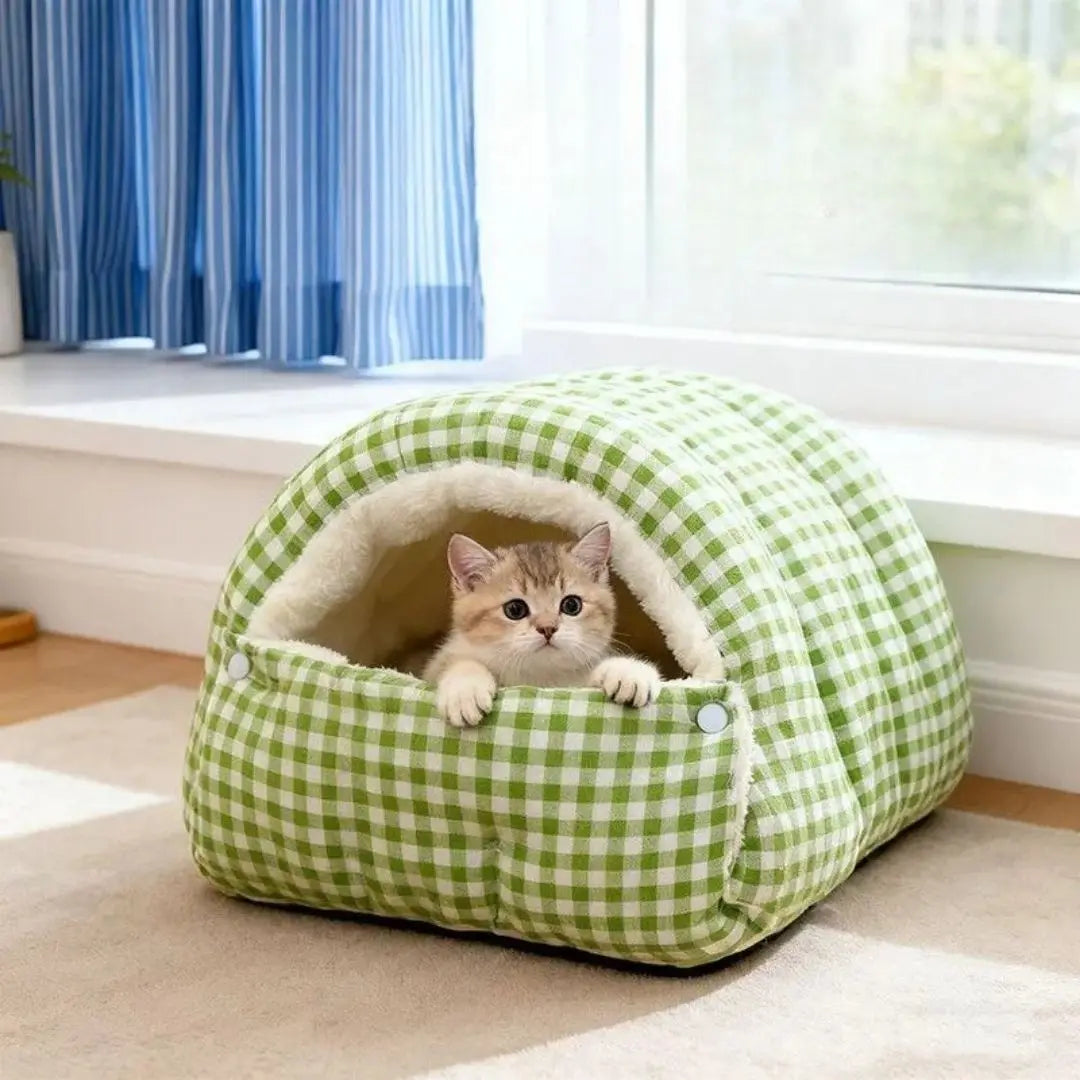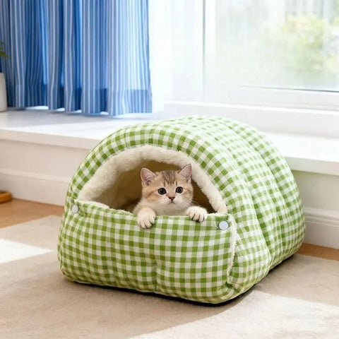 Checkered Cat House Winter Warm Enclosed Pet Bed for Cats - Green / S